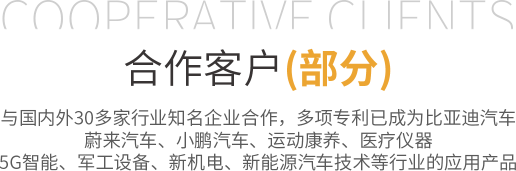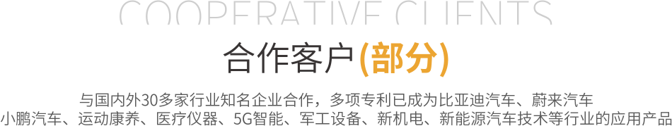 目前與國內外30多家行業知名企業合作,多項專利已成為比亞迪汽車、蔚來汽車、小鵬汽車、運動康養、醫療儀器、5G智能、軍工設備、新機電、新能源汽車技術等行業的應用產品。